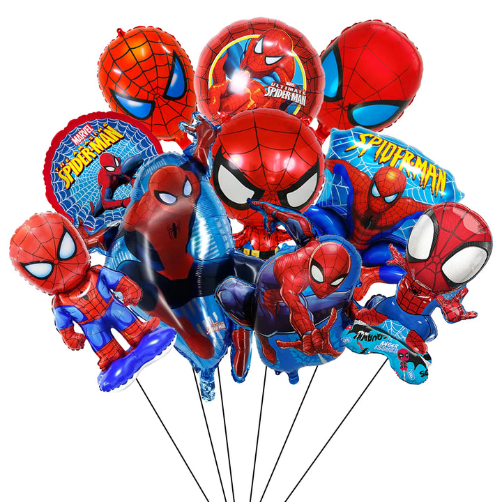 Spiderman Foil Balloon Set: Our spiderman birthday balloon set includes 8 character balloons, 2 spiderman round balloonsand other spiderman birthday decorations.