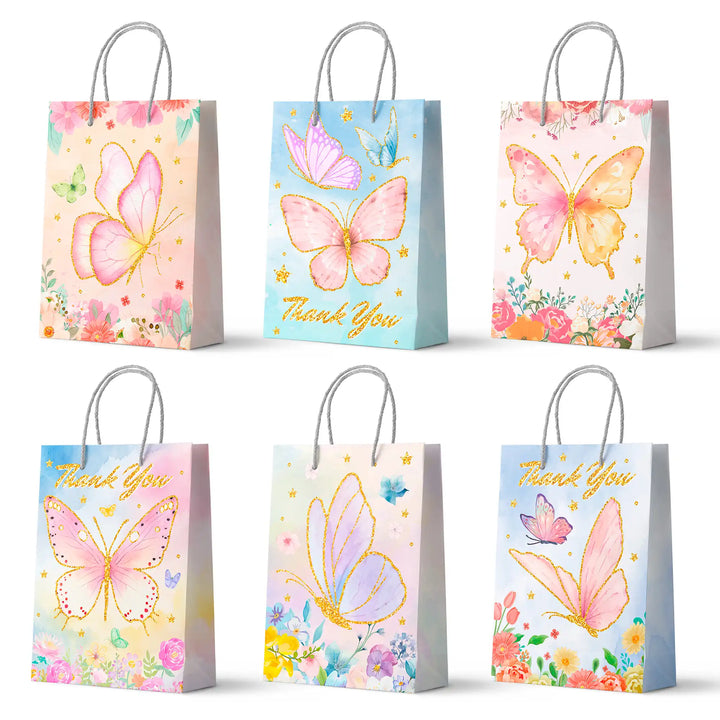 Butterfly Gift Bags for Party Favors: You will receive 24pcs of beautifully designed butterfly birthday party bags, which include 6 different styles of butterfly bags, so that these butterfly birthday decorations paper bags can bring you a better experience.