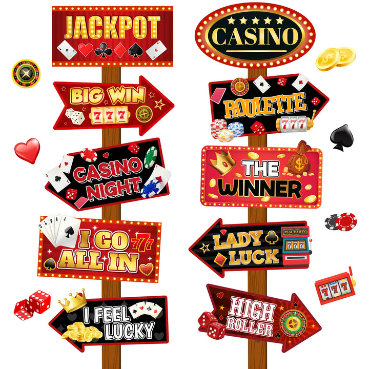 Casino Party Sign Set: You will receive 20 pieces of casino theme party sign in 10 different styles, 2 pieces of las vegas party signs per style, providing you with enough quantity and styles to meet your casino theme party decorations needs.