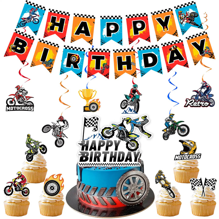 Motorcycle Birthday Decorations Pack: Our dirt bike birthday party decorations set includes 1 motorcycle birthday banner, 6 motocross party hangling swirls, 12 motocross cupcake decorations etc motocross birthday party decorations.