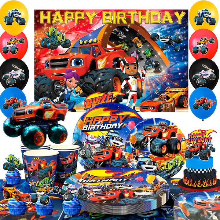 🏎Monster Truck Birthday Party🏎 Our monster jam birthday party supplies includes 1 monster truck tablecloth, 1 monster truck backdrop, 1 monster trucks aluminum film balloon, 12 monster truck balloon, 13 monster truck cake topper, 16 9'' monster truck plates, 16 7'' monster truck party plates, 16 monster truck paper cups, 16 monster truck napkins and other monster truck party supplies.