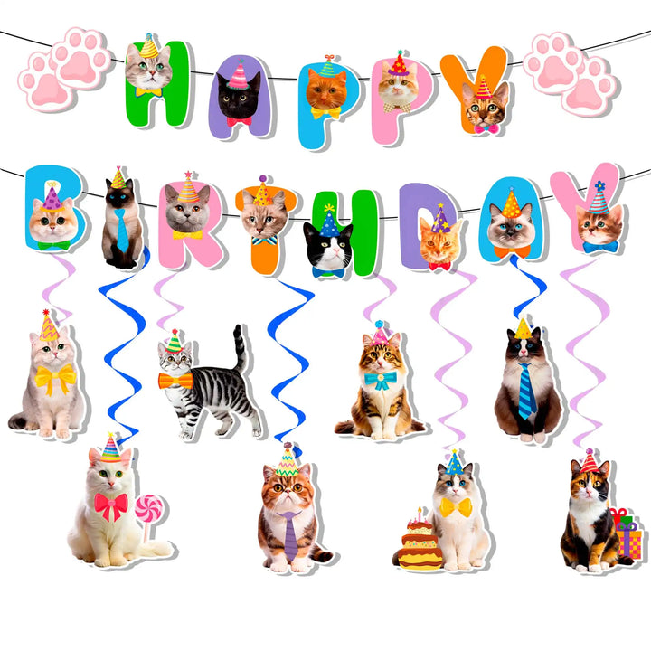 Cat Birthday Decorations Pack: Our cat themed birthday party supplies include 1 cat theme birthday party banner and 8 cat swirl decorations, perfect for use as cat birthday party decorations to add a touch of playfulness to the party space.