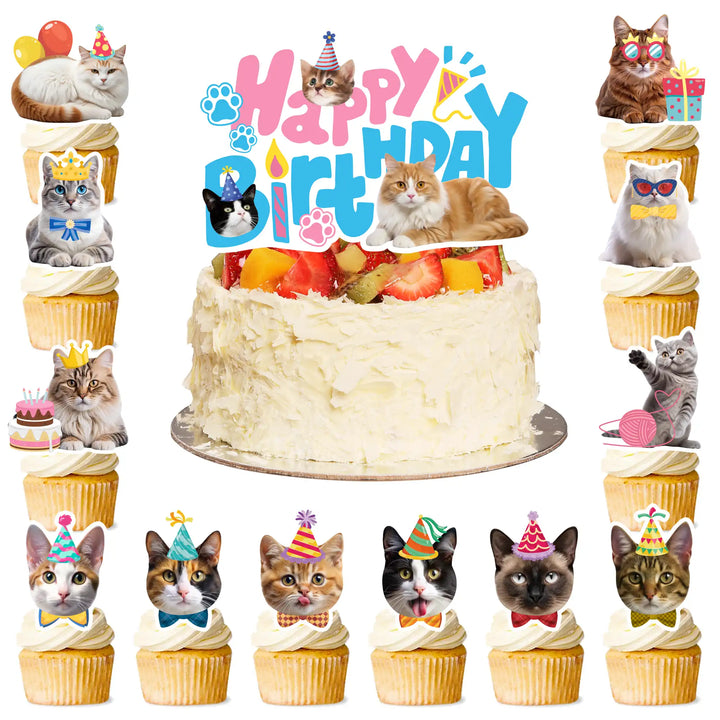 Cat Cake Toppers Set: This cat birthday cake topper set includes 1 cat cake decorations and 24 cat cupcake toppers, using the cats face cake toppers can create a pleasing visual effect for your cat birthday party.