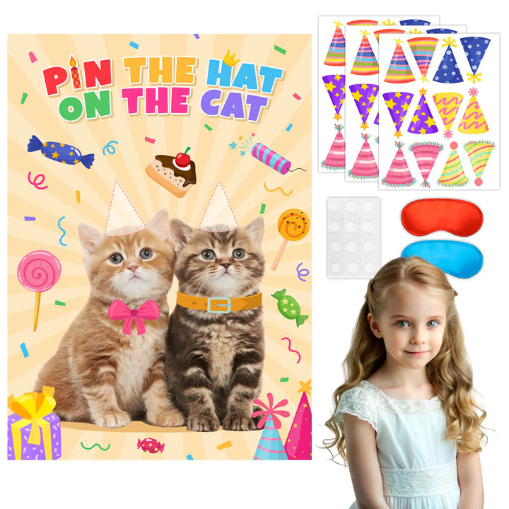 Cat Birthday Party Games: This set of pin the hat on the cat party games supplies includes 1 cat themed birthday games poster, 1 dot sticker, 2 cat party games blindfold and 3 cat birthday hat stickers, a fun cat birthday party games for kids.