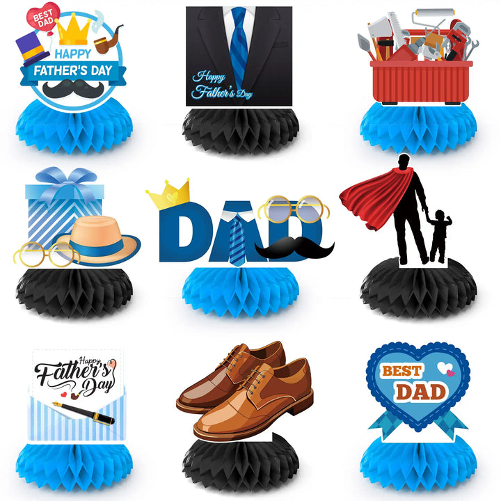 Father's Day Themed Design: The design of these father's day honeycomb centerpieces is inspired by father's day, including classic father's day elements such as gift, shoes and bow tie, which is easy to be favored and loved by children and adults during the father's day birthday party.