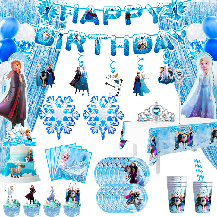 🧊 Frozen Decorations for Birthday Party🧊 Frozen party supplies include 10 7" frozen party plates,10 9" frozen birthday party plates,10 frozen napkins,1 big frozen cake toppers,1 frozen tablecloth,2 frozen birthday banners,12 frozen cupcake toppers,2 snowflake balloons,2 Elsa and Anna frozen foil balloons,1 frozen wands for girls and 1 Elsa birthday crown etc frozen birthday decorations for girls.