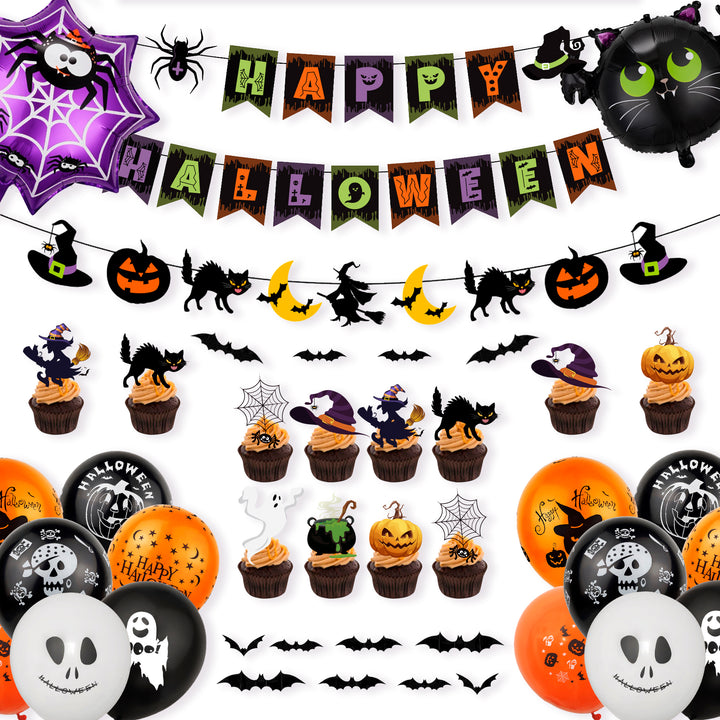 Halloween Party Decoration Pack:This happy halloween decorations for party including 1 halloween banner, 2 halloween foil balloons,24 halloween party balloons,12 3D halloween bat decorations & 12 halloween cupcake toppers and other halloween decorations for party.