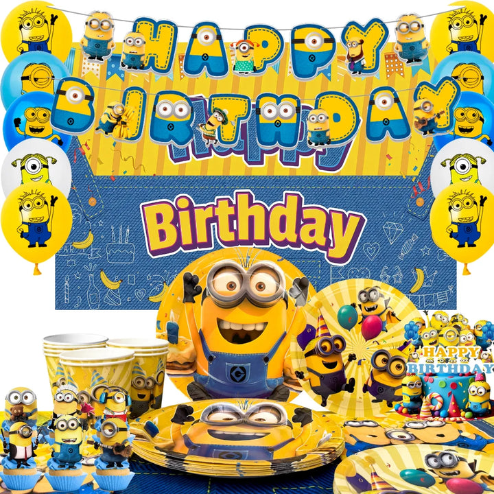 Minions Birthday Decoration Set: This Minions party supplies set includes a Minions birthday banner, a Minions cake topper, a Minions tablecloth, 10 7" Minions party plates, 10 9" Minions birthday plates, 10 Minions birthday napkins, 10 Minions party cups, 12 Minions cupcake toppers, and 12 Minions birthday balloons.