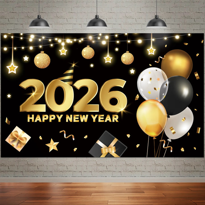Unique Design: This happy new year backdrop 2026 is specially designed for the new year 2026, and the new years backdrop has lifelike balloons, gifts, "Happy New Year 2026" and other glittering New Year patterns, which will make your family and friends have a happy new year party.