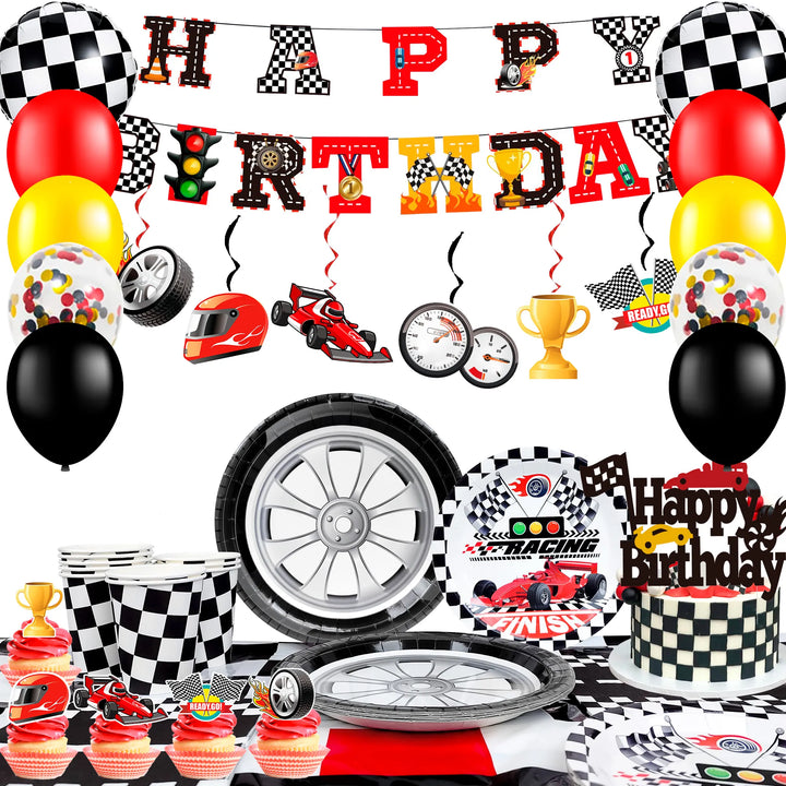 Exciting Race Car Birthday Decorations: This racing car party supplies includes 1 race car happy birthday banner, 1 race car table cloth, 2 race car foil balloons, 6 race car party hanging swirls, 10 7'' race car birthday plates, 10 9'' race car party plates, 12 race car birthday party balloons, 13 race car cake topper etc race car birthday party decorations.