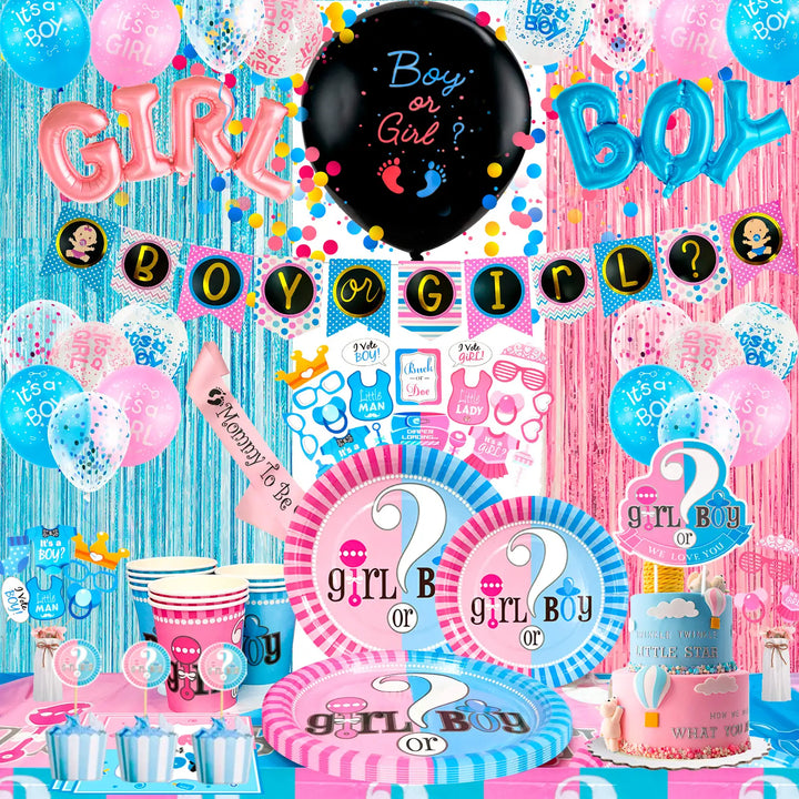 Baby Gender Reveal Party Supplies,118pcs gender reveal party decorations&Tableware Set-Gender Reveal Balloons,Boy or Girl Banner Balloons Plates Cups Tablecloth Fringe Curtains Photo Booth Props etc..