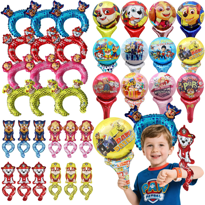 Complete Paw Patrol Balloon Set: This Paw Patrol balloon set contains 36 Paw Patrol birthday balloon decorations, including 12 Paw Patrol handheld foil balloons, 12 Paw Patrol balloon headbands, and 12 Paw Patrol wristband balloons. Our Paw Patrol party decorations are plentiful and can meet all your Paw Patrol party decorating needs.