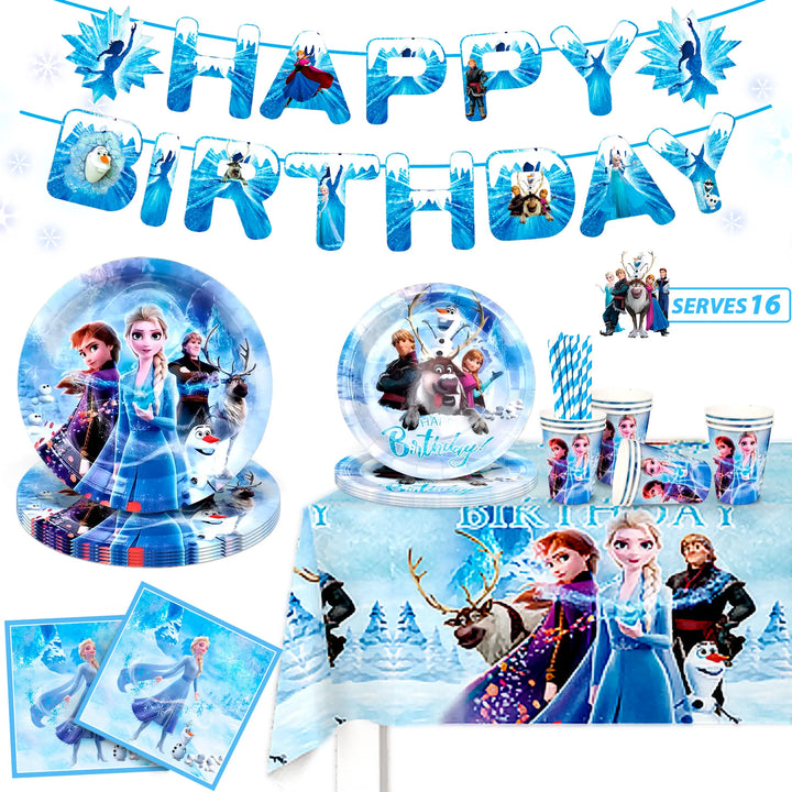 📦 Frozen Birthday Party Supplies Package 📦 The frozen party tableware set includes: 16 * 7 inch frozen birthday plates, 16 * 9 inch frozen party plates, 16 frozen napkins, 1 frozen tablecloth, 1 frozen birthday banner, 16 straws, serves 16 guest.