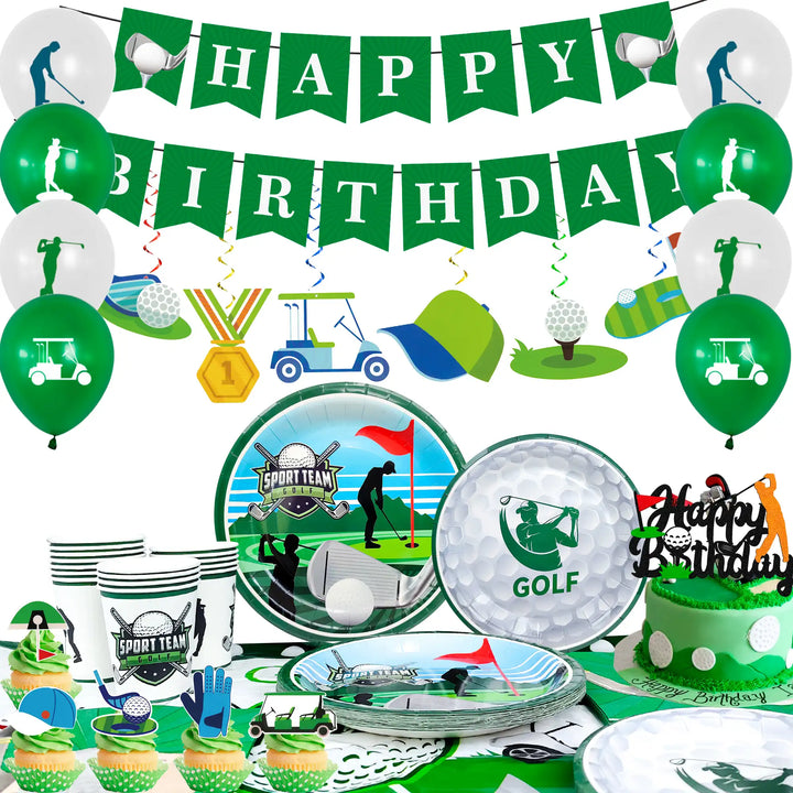 Golf Birthday Decorations Set: This golf birthday party supplies includes 1 golf birthday banner, 1 golf table cloth, 6 golf party hanging swirls, 12 golf birthday balloons, 13 golf cake decorations, 16 7'' golf birthday plates, 16 9'' golf party plates, 16 golf napkins for party, 16 golf party cups etc golf birthday party decorations.