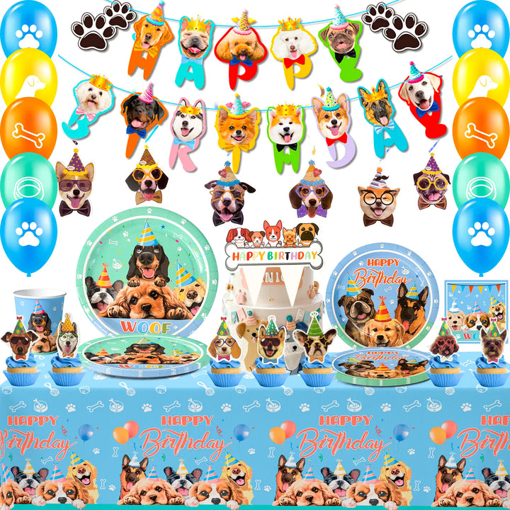 🐕Puppy Party Supplies 🐕This dog themed birthday party supplies include 16 7'' puppy party plates, 16 9'' dog party plates, 16 dog napkins, 16 paper cups, 16 cutlery sets, 12 balloons, 12 small dog cupcake toppers, 6 dog face birthday swirl hanging ,1 dog tablecloth, 1 large dog cake topper and 1 "Happy- Birthday" banner ect.