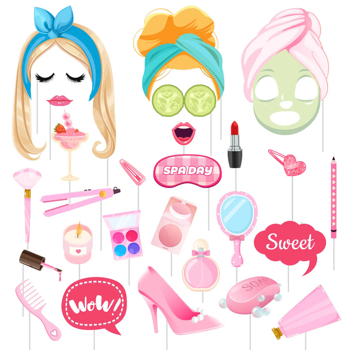 Pink Spa Photo Booth Props: You will receive 26 pieces of spa day photo booth props, sufficient quantity and diverse designs can easily meet your makeup birthday party decorations, spa birthday party decorations and selfie needs.