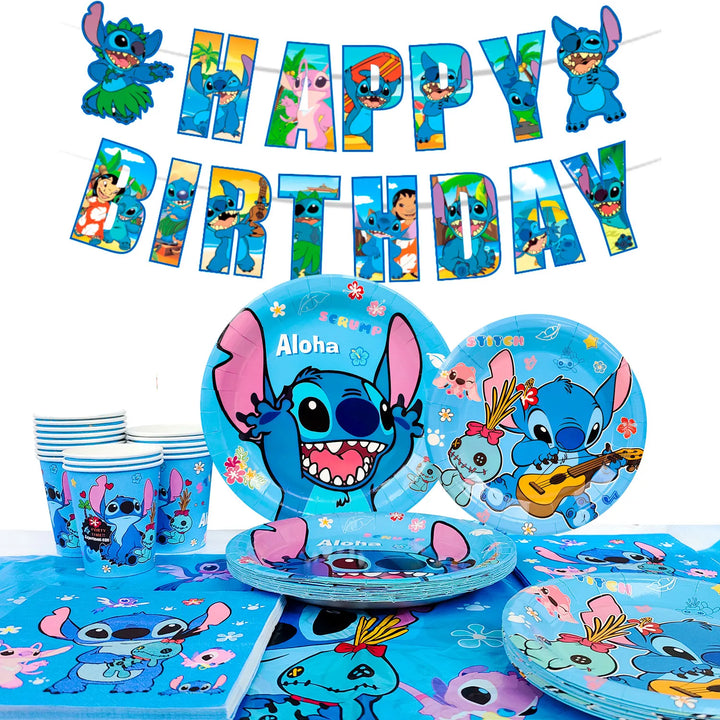 Stitch Birthday Party Decorative Tableware: Our Stitch party supplies tableware set includes 1 Stitch Birthday Party Banner, 1 Stitch Tablecloth, 16 7-inch Stitch Birthday Party Plates, 16 9-inch Stitch Party Plates, 16 Stitch Birthday Party Napkins and 16 Stitch Cups and other Stitch party decorations.