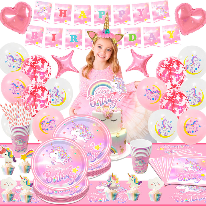 🍭Unicorn Party Pack🍭This unicorn party supplies set consists of 1 unicorn birthday banner, 1 unicorn cake topper, 1 unicorn horn headband, 1 unicorn party table cloth, 12 unicorn balloons birthday decorations, 16 unicorn plates cups and napkins and other unicorn birthday supplies for girls kids.