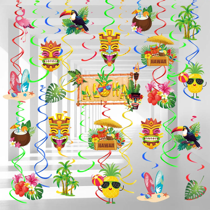 Luau Hanging Swirl Decorations: Package includes 32pcs Hawaiian party hanging swirl decorations, including 24pcs foil swirl decor with Hawaiian Luau cutout cards in 12 different styles, and 8pcs double spiral decorations