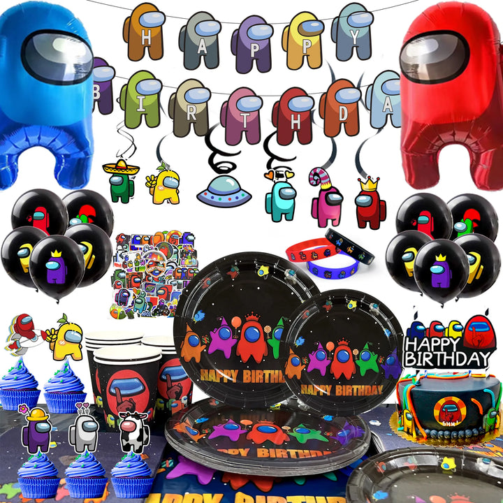 👑Among Us Birthday Set👑144 pcs Among Us birthday decoration set includes 1 tablecloth, 10 x 7 inch plates, 10 x 9 inch plates, 10 paper cups, 20 tissues, 6 party hats, 1 happy birthday banner, 6 spiral decorations, 1 large cake topper, 10 small cake toppers, 16 Among Us balloons, etc. Among Us birthday decorations.
