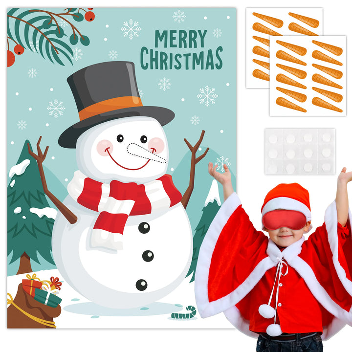 How to Play: Christmas games is simple and fun! First, stick the pin the nose game poster on the wall and draw a line on the floor as the starting line. Second, choose a carrot sticker and put on christmas blindfold. Third, fix the carrot sticker on the snowman. Finally, whoever has the carrot stickers christmas closest to the target area wins.