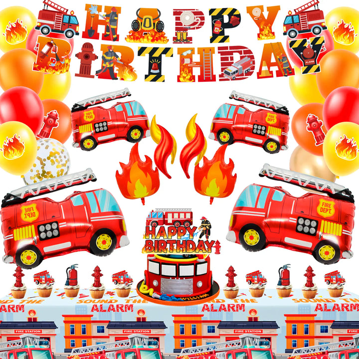 Fire Truck Party Decorations Pack: This firetruck birthday decorations set includes 1 fire truck birthday banner, 1 firetruck cake topper, 1 fire truck table cloth, 2 firetruck cupcakes toppers, 6 flame foil balloons, 85 fire truck party balloons etc firefighter birthday party decorations.