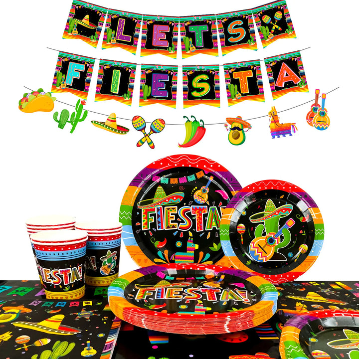 🌵【Fiesta Party Supplies Set】You will get 163pcs mexican themed fiesta party supplies set Including 1 fiesta party banner,1 fiesta tablecloth,20 7" fiesta party plates,20 9" fiesta paper plates,20 cups,20 fiesta napkins and 20 sets of knives, forks and spoons.