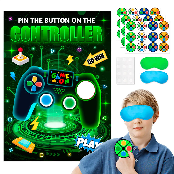 How to Play is Simple: First, put the video party games poster on the wall, then the participants put on the gamer party blindfold and stick the video button game stickers on the video game poster, the person closest to the target area wins.