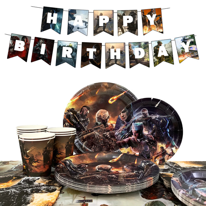 Call of Duty Birthday Party Supplies Set: Our Call of Duty birthday party decorations set includes 1 Happy Birthday Call of Duty banner, 1 Call of Duty tablecloth, 16 7" Call of Duty plates, 16 9" birthday party Call of Duty plates, 16 birthday party Call of Duty napkins, 16 Call of Duty party cups, and other Call of Duty birthday party tableware.