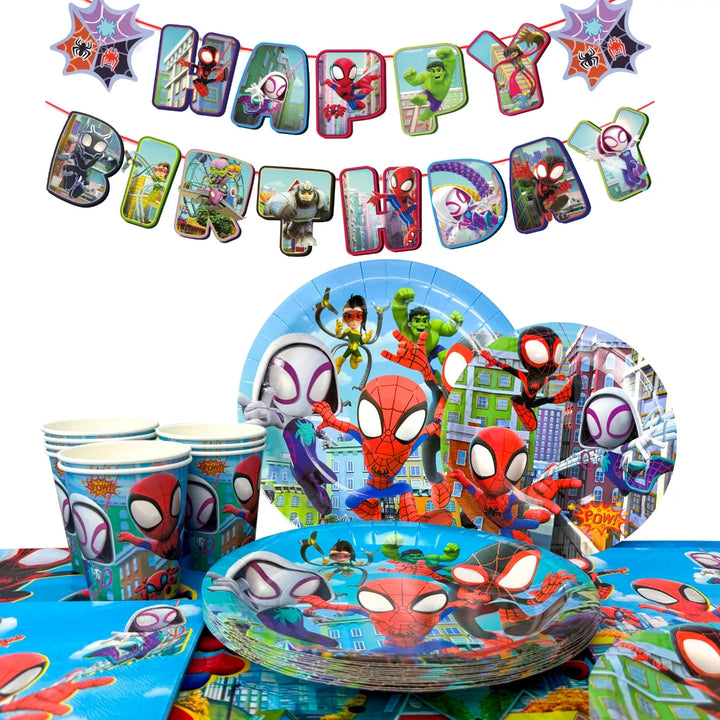 Spider-Man & Friends Birthday Party Supplies Set: Our Spider-Man & Friends birthday party decorations set includes a Happy Birthday banner, a tablecloth, 16 7" plates, 16 9" birthday party plates, 16 birthday party napkins, 16 party cups, and other birthday party tableware.