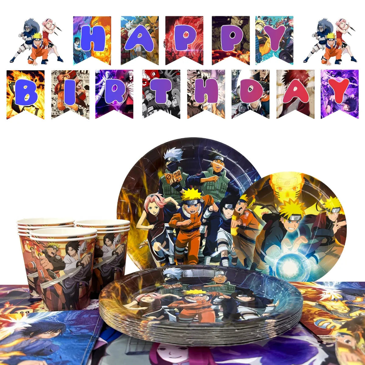 16-Persons Naruto Birthday Party Decoration Tableware Set, Naruto Party Supplies Tableware including Naruto Tablecloth Banner Plates Napkins Cups, suitable for Naruto Birthday Party Decoration