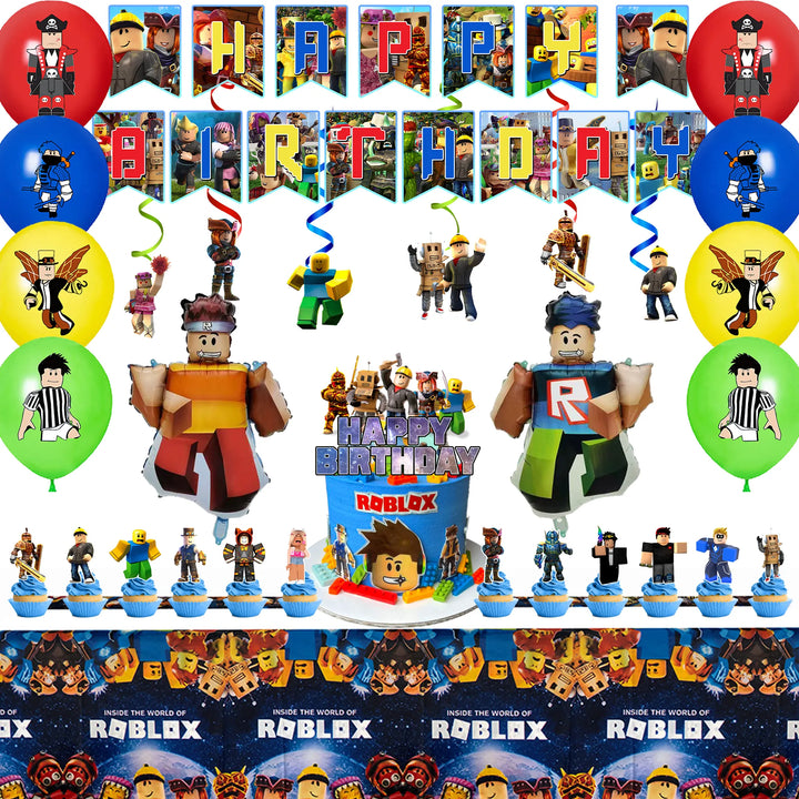Roblox Party Decorations Pack: This roblox birthday decorations set includes 1 roblox birthday banner, 1 roblox cake topper, 1 roblox tablecloth, 2 roblox foil balloons, 6 roblox spiral decorations, 12 roblox cupcake toppers, 12 roblox party balloons, and other roblox birthday party decorations.