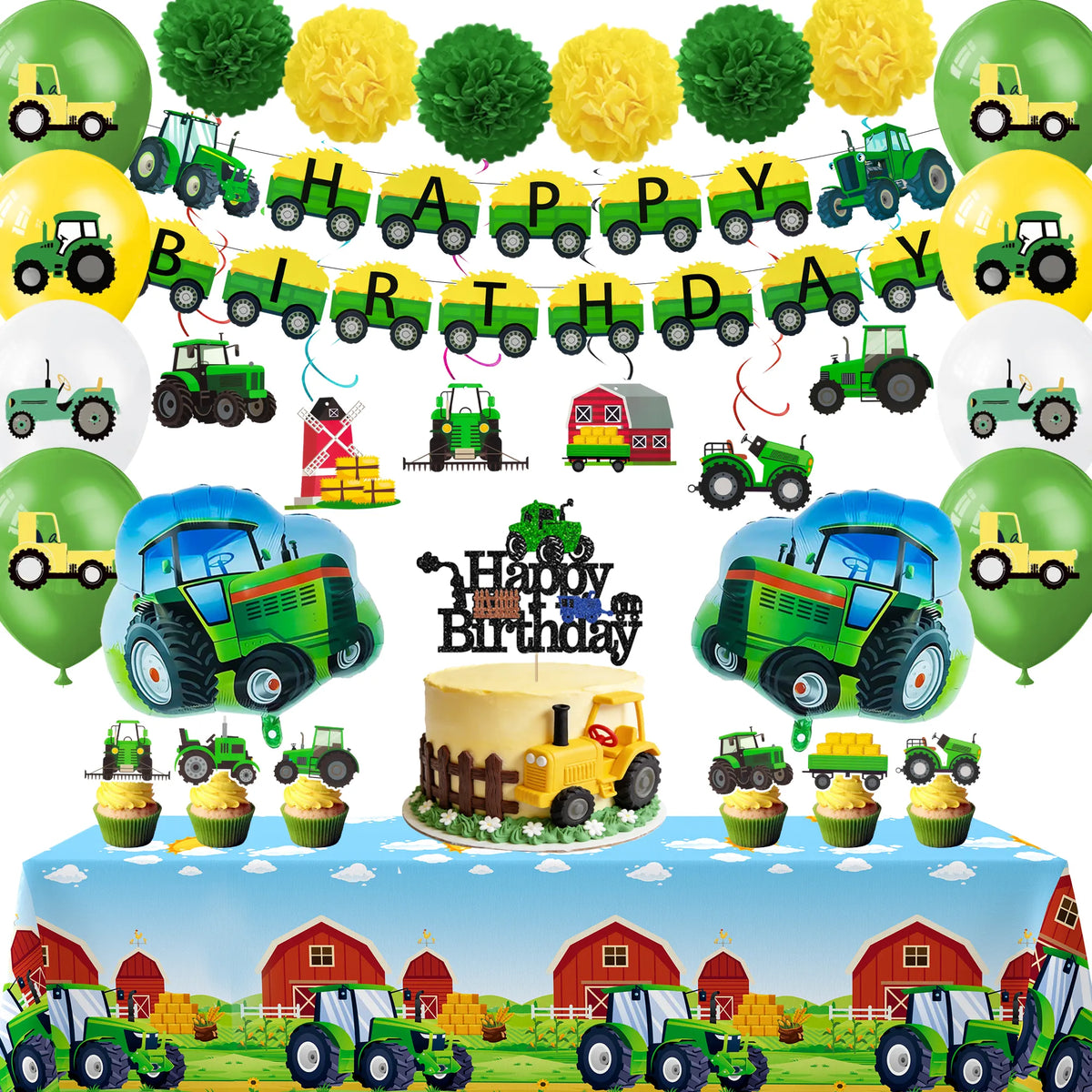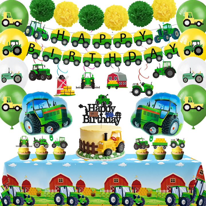 55 Pcs tractor birthday decorations Kit:This set of tractor birthday decorations includes1 tractor birthday party tablecloth, 2 tractor birtday foil balloons,6 paper flowe balls,6 tractor hanging party decorations,12 tractor birthday party balloons,13 tractor party cake toppers,15 tractor birthday banner and these tractor birthday decorations will make your tractor birthday party more interesting