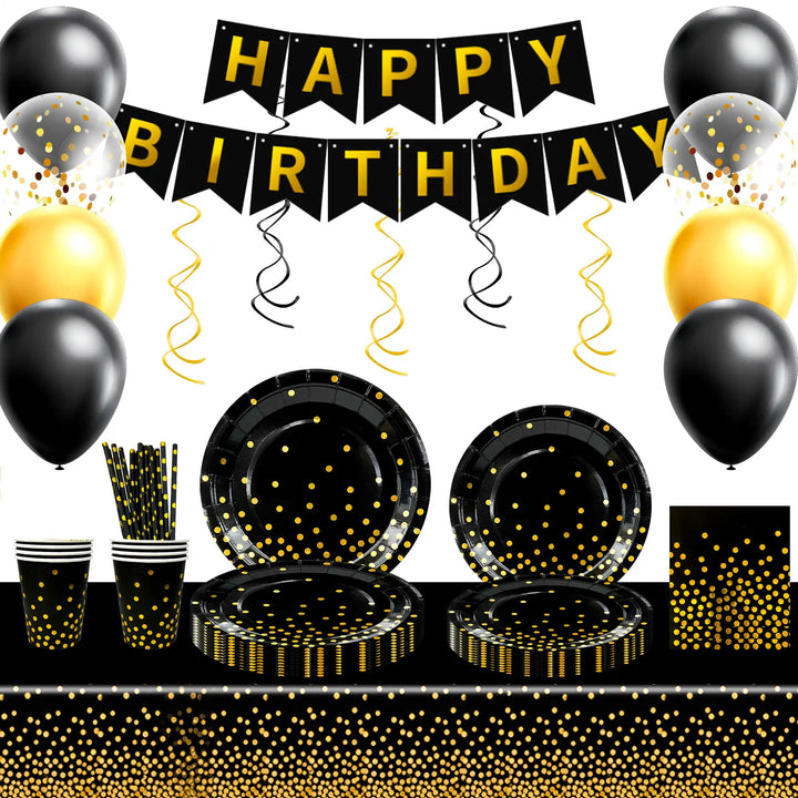 Black Gold Polka Dot Tableware Set: Our black gold polka dot dinnerware set includes 1 black and golden table cloth, 12 glod dot balloon, 16 7'' black and gold paper plates, 16 9'' black and gold plates, 16 black golden dot napkins and other black and gold party supplies.