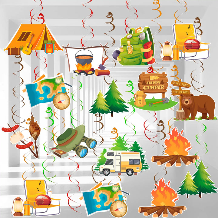 Package Includes: You will receive 24 pieces of camping cardstock and camping hanging foil swirls, plus 8 pieces of two-way camper party hanging swirls, for a total of 32 pieces of camping hanging swirl party decorations.