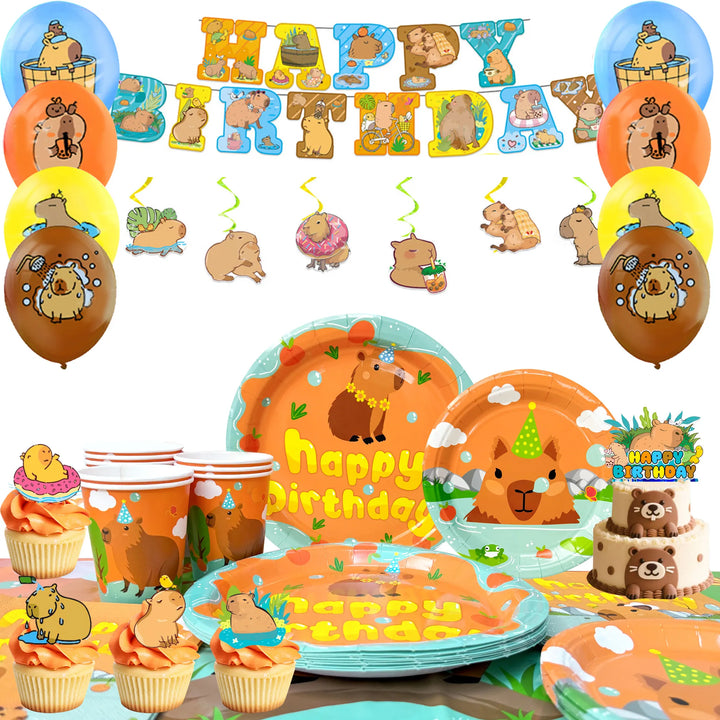 Capybara Party Decorations: This Capybara Birthday Party Decorations Set includes 1 Capybara Tablecloth, 1 Capybara Party Banner, 10 9" Capybara Birthday Party Plates, 10 7" Capybara Plates, 10 Capybara Party Napkins, 10 Capybara Paper Cups and other Capybara Party Supplies.