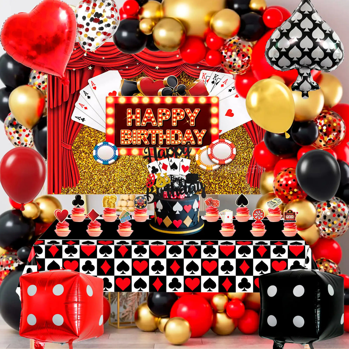 Casino Party Decorations Kit: Our decorations set include 1 casino party tablecloth, 1 casino backdrop, 1 casino cake topper, 12 casino cupcake topper, 66 casino party balloons etc las vegas party decorations.
