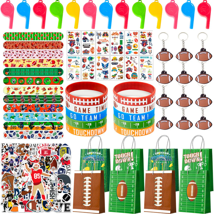 ✨Football Gifts for Team Set✨ Our football favors for team set include 12 football party bags, 12 football bracelets, 12 football stickers, 12 football party whistle, 12 football theme eraser etc football goodie bag fillers for football party decorations.