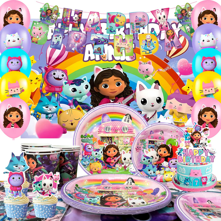 Cartoon Dollhouse Party Decorations: This cartoon dollhouse birthday party decoration set includes a tablecloth, a party banner, a backdrop, 10 9" birthday party plates, 10 7" plates, 10 party napkins, 10 paper cups, 12 cupcake toppers, 12 balloons, and other cartoon dollhouse party supplies.