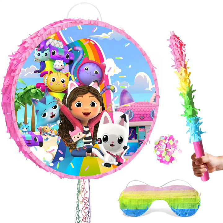 Charming Gabby's Dollhouse Pinata: Our Gabby's Dollhouse pinata set includes 1 large dollhouse birthday decorations round pinata, 1 cat ear eye mask, 1 party stick, 1 bag of confetti and other dollhouse-themed birthday party decorations.