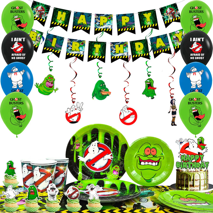 Ghostbusters Party Supplies: The ghostbusters party decorations supplies include 1 ghostbusters cake topper,1 ghostbusters birthday banner, 1 ghostbusters tablecloth, 10 7''ghostbusters party plates, 10 9''ghostbusters paper plates, 12 ghostbusters cupcake toppers & 12 ghostbusters balloons etc ghostbusters decorations.