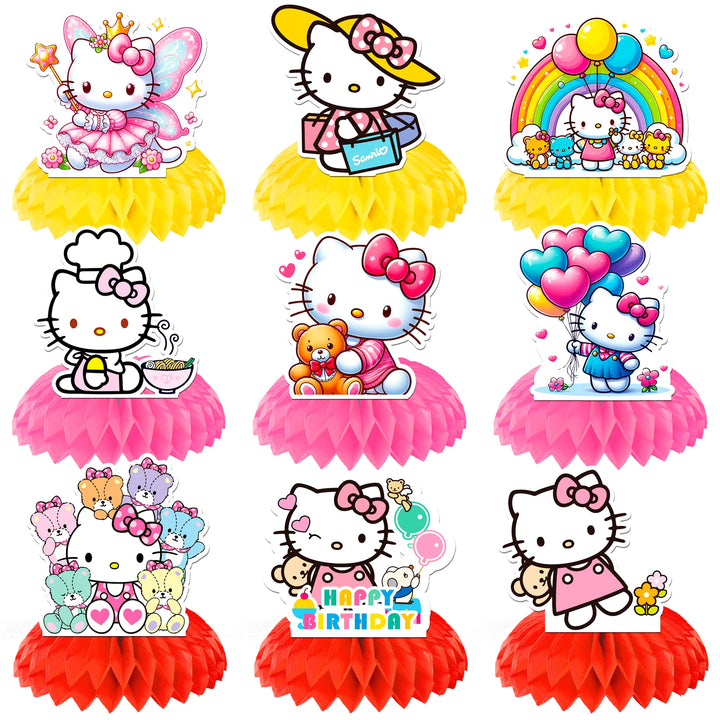 Hello Kitty Table Decorations: You will get 9 Hello Kitty honeycomb centerpieces suitable for birthdays, these Hello Kitty decoration honeycomb centerpieces can easily bring more joy and fun to your Hello Kitty theme party decorations.