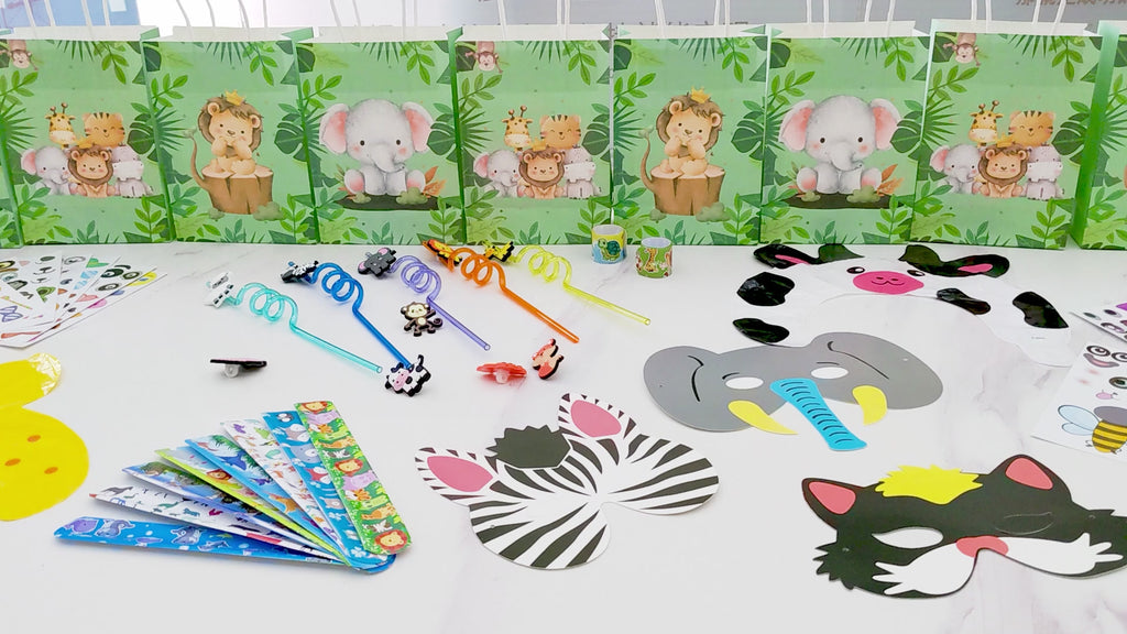 Jungle Safari Party Favors, 72pcs Jungle Safari Birthday Party Favors Set Includes Safari Party Slap Bracelets Stickers Straws Balloon, Animal Mask, Safari Goodie Bags etc Jungle Party Favors for Kids
