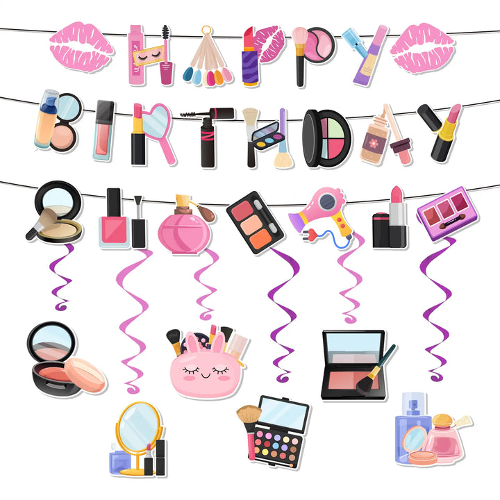 Great Makeup Party Decorations kit: This makeup spa party decorations package including 1makeup happy birthday banner & 6 makeup theme party decorations hanging swirls etc makeup birthday party supplies, perfect for makeup birthday decorations & spa birthday party decorations.