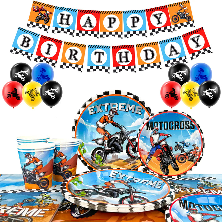 🏁Complete Motorcycle Birthday Party Supplies Set🏁Our dirt bike party supplies include 1 dirt bike happy birthday banner, 1 dirt bike party tablecloth, 10 7'' bike party plates, 10 9'' motorcycle theme party paper plates, 10 dirt bike birthday napkins, 12 motorcycle latex balloon etc motocross birthday party supplies.