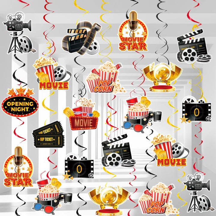 Movie Night Hanging Swirl Set: This movie night hanging swirl decorations set contains 57 movie night party hanging swirls, enough style and quantity to meet your movie night hanging decorations and movie night party decorations needs.