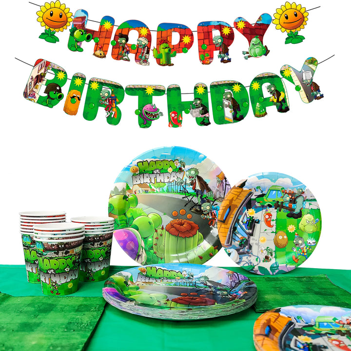 😃Zombies Birthday Supplies Set😃This Peas and Zombies Party Supplies Kit includes 1 Zombies Birthday Party Banner, 16 Zombies Party Plates, 16 Zombies Party Cups, and other botanical birthday party decoration supplies for 16 guests.