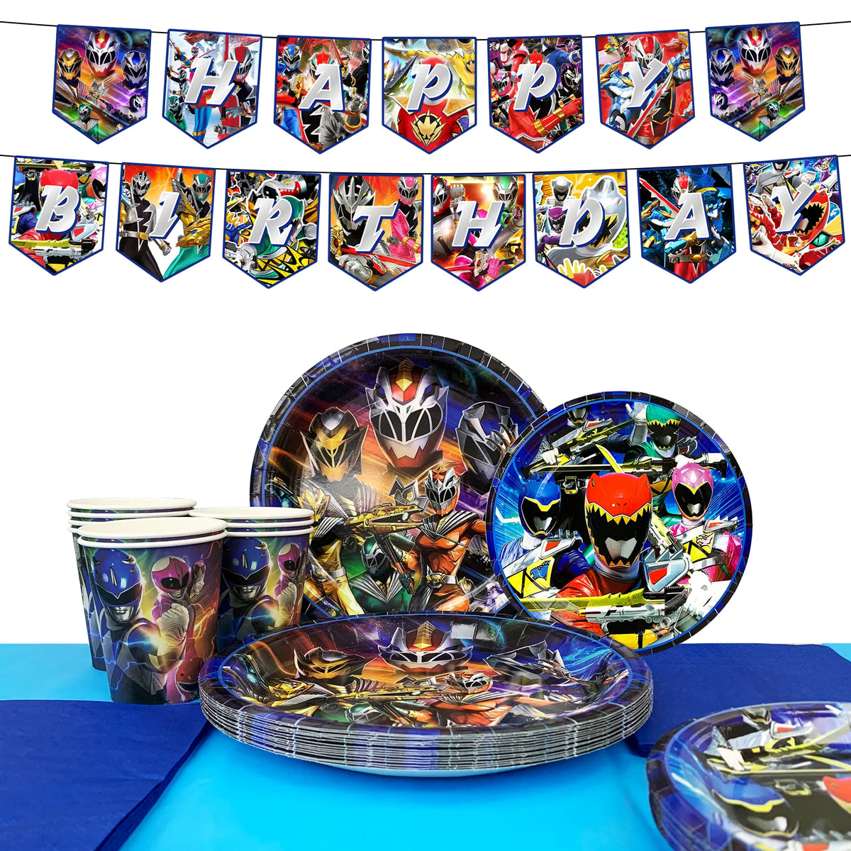 Power Rangers Birthday Party Supplies Set: Our Power Rangers birthday party decoration set includes 1 Happy Birthday Power Rangers banner, 1 Power Rangers tablecloth, 16 7'' Power Rangers plates, 16 9'' Power Rangers birthday party plates, 16 Power Rangers birthday party napkins, 16 Power Rangers party mugs, and other Power Rangers birthday party tableware.