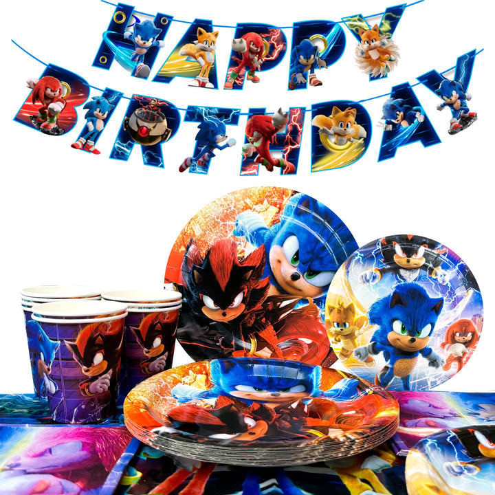Sonic Birthday Party Decorative Tableware: Our Sonic party supplies tableware set includes a Sonic birthday party banner, a Sonic tablecloth, 16 7" Sonic birthday party plates, 16 9" Sonic party plates, 16 Sonic birthday party napkins, and 16 Sonic cups, among other Sonic party decorations.