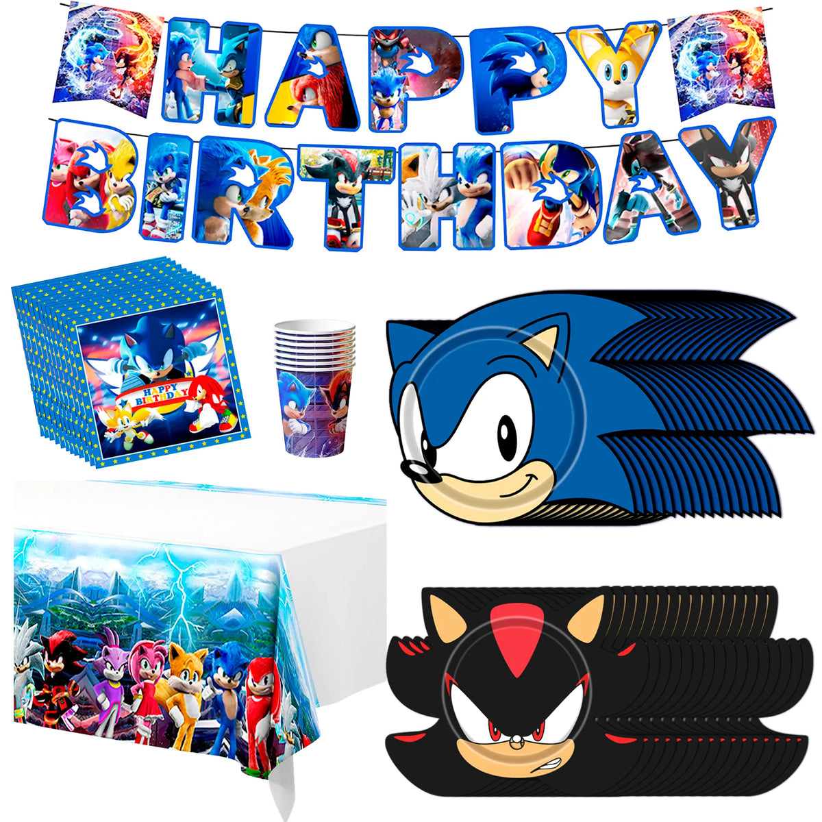 Sonic Shaped Cutlery: Our Sonic party cutlery set includes 1 Happy Birthday banner, 1 tablecloth, 16 Sonic shaped party plates, 16 Shadow the Hedgehog shaped birthday plates, 16 birthday napkins, 16 paper cups, and other Sonic birthday cutlery.